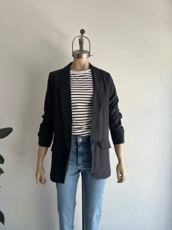 Descripción: Blazer con mangas con frunce a la altura del codo. Bolsillos laterales. Interior forrado.