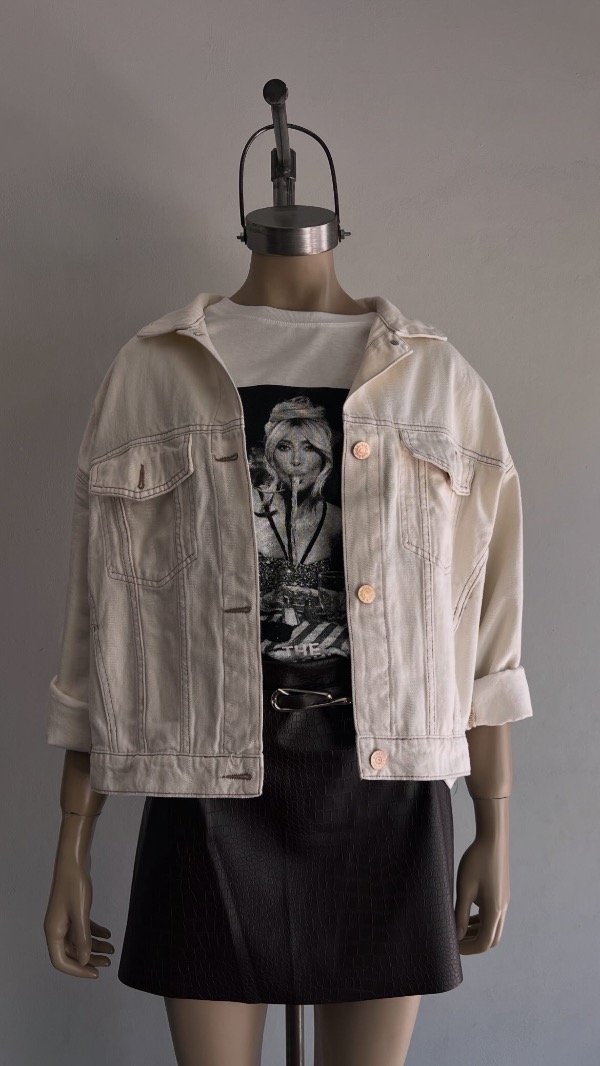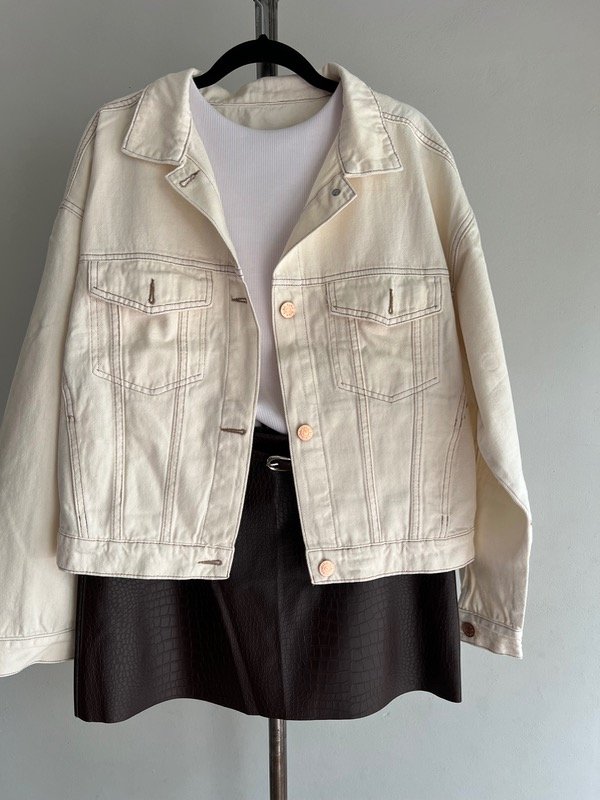 Campera de JEAN rígida calce oversize clásica. Es color marfil con bolsillos y charreteras. Tiene las costuras color camel claro y los avíos cobre brillante.