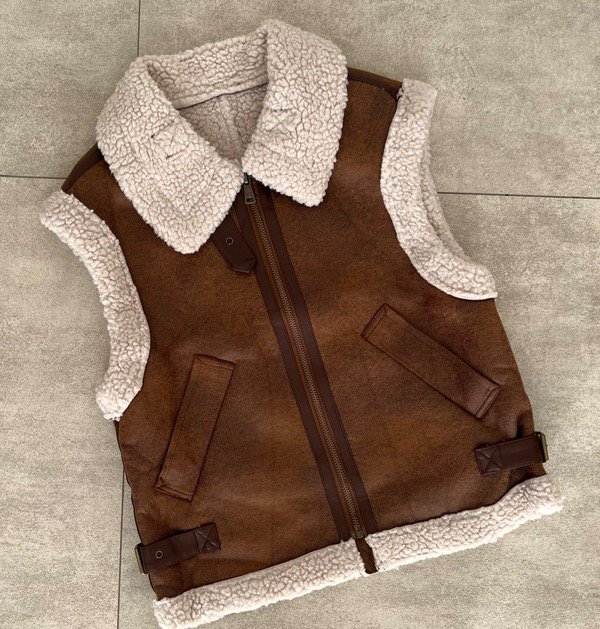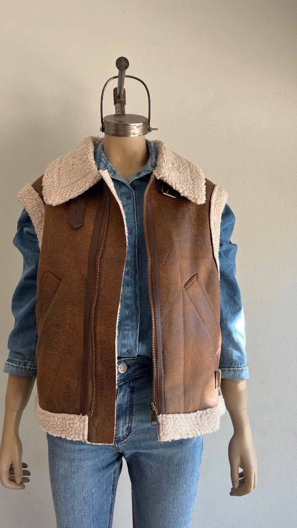 Descripción: Chaleco confeccionado en cuero sintético con acabado desgastado y forro interior de corderito extra suave. Cierre frontal metálico, bolsillos con cierre vertical y detalles en cuero marrón oscuro. Incluye cuello alto con hebilla ajustable