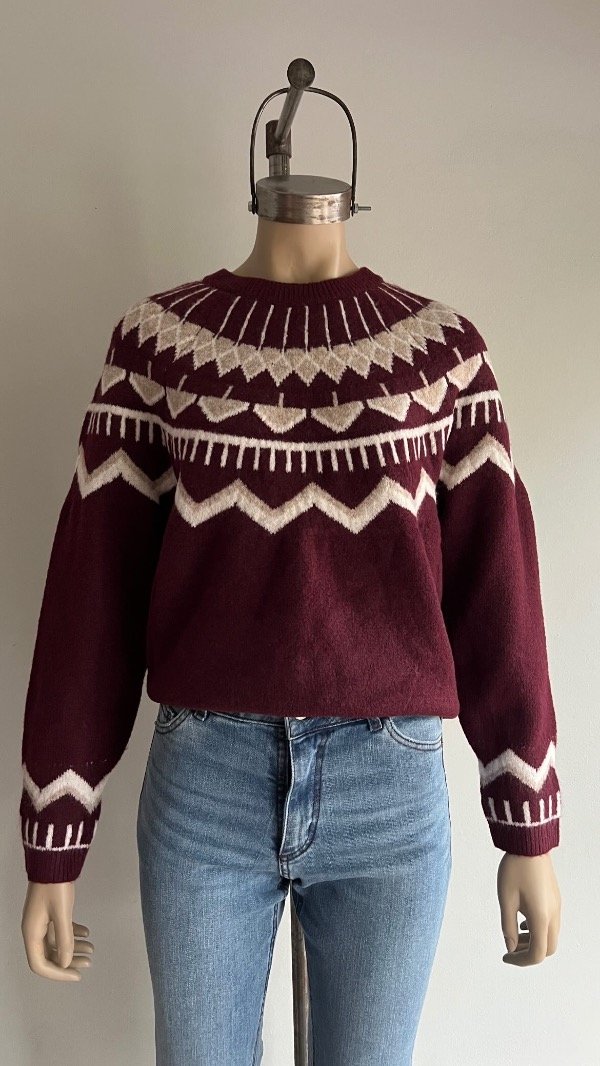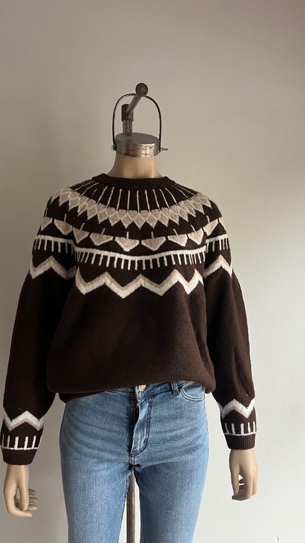 Sweater de bremer con diseño jacquard . Un modelo de un tejido suave y super calentito con detalles geometricos en mangas y cuello.