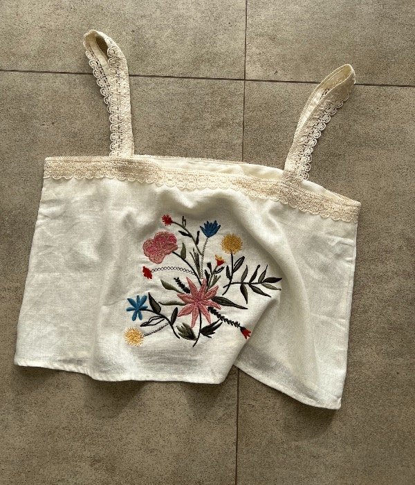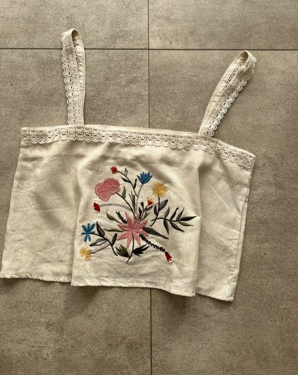 Descripción: Top de escote recto y tirantes finos. Detalle de puntilla. Bordado en delantero.